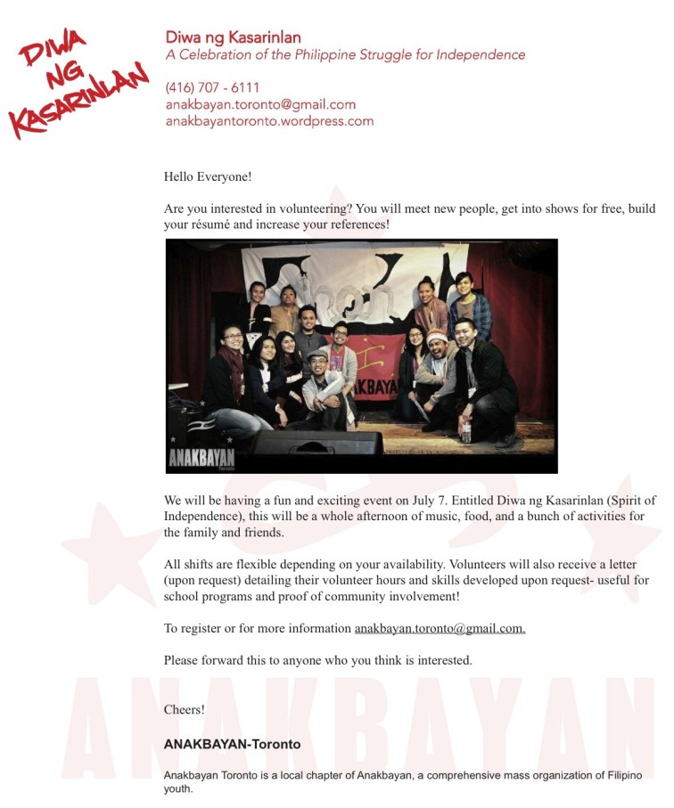 Diwa ng Kasarinlan is a free all day event that aims to bring together the Filipino community across the Greater Toronto Area for the purpose of celebrating the Philippine struggle for independence through awareness of our history.