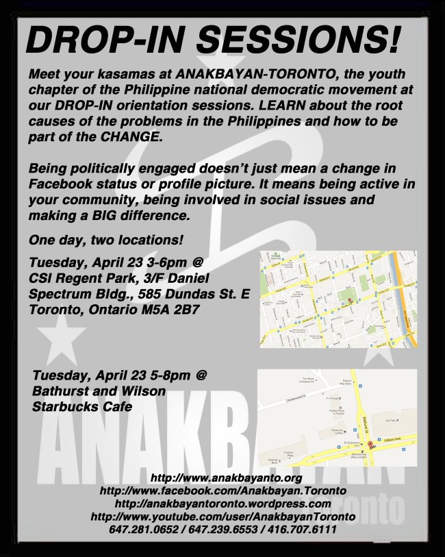 Meet your kasamas at ANAKBAYAN-TORONTO, the youth chapter of the Philippine national democratic movement at our DROP-IN orientation sessions. LEARN about the root causes of the problems in the Philippines and how to be part of the CHANGE.