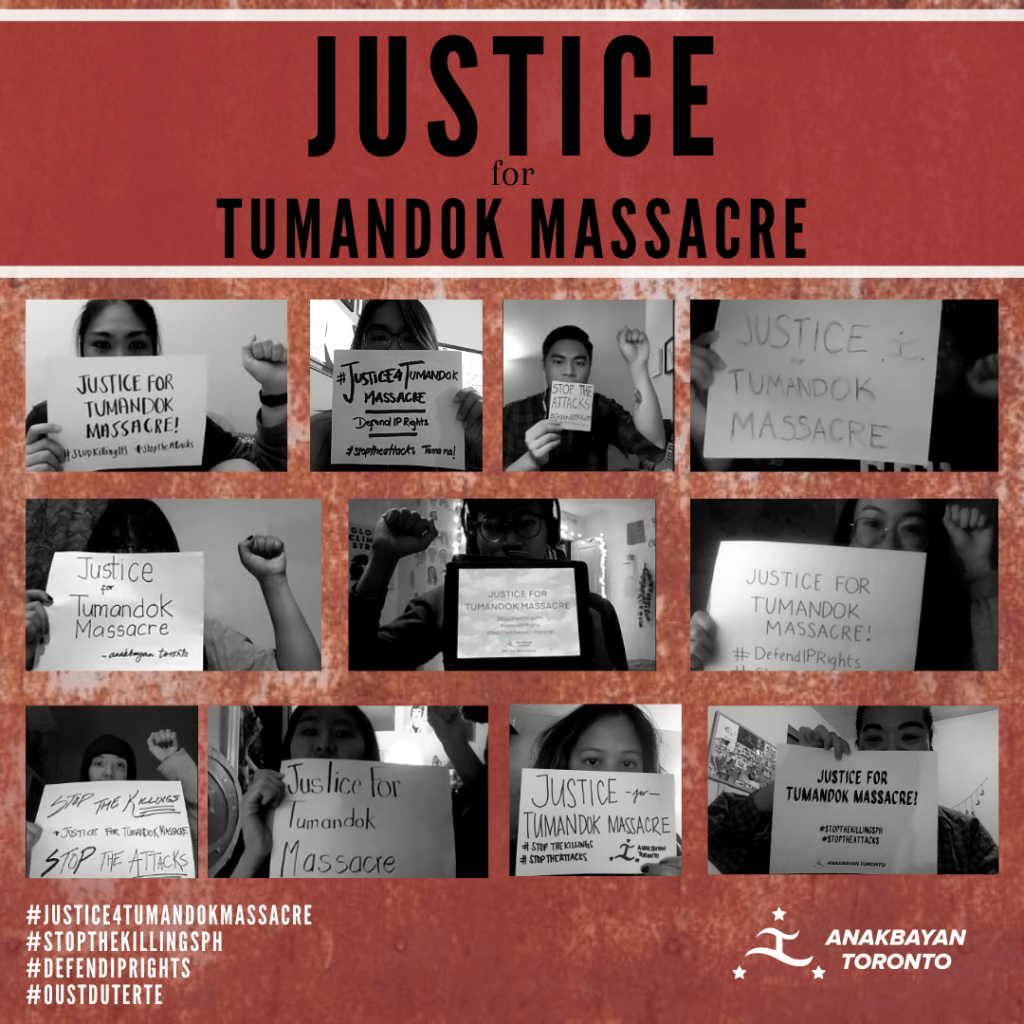The intensified state terror against Indigenous people in the Philippines for resisting further shows the fascist US-Duterte regime’s persistence in silencing any opposition using military forces through violence and murder. Anakbayan Toronto condemns the Tumandok massacre and attacks on Indigenous peoples in the Philippines, Canada, and across the world. We call on Filipinos in Canada to hold Canadian mining companies and the Philippine government accountable in displacing and committing human rights violations on ancestral lands in the Philippines. We amplify the call to demand justice for the victims of the Tumandok Massacre and to stop the killings in the Philippines!
