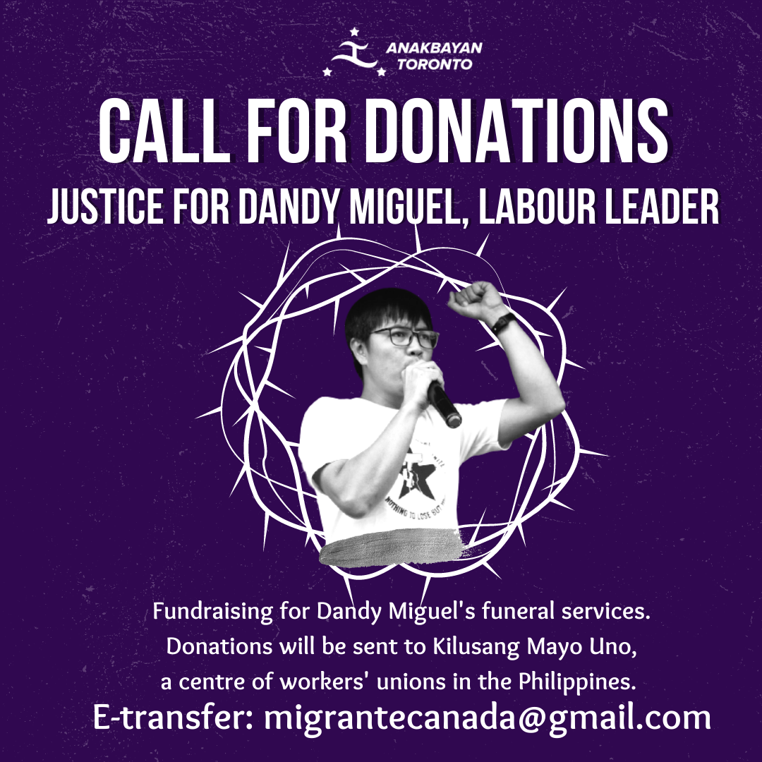 With the continuous attacks in Southern Tagalog, advocates are seeking donations to pay for the funeral services for Dandy Miguel. If you would like to donate, you can e-transfer funds to Migrante Canada (migrantecanada@gmail.com). Funds will be sent to Kilusang Mayo Uno, a centre of workers’ unions in the Philippines.