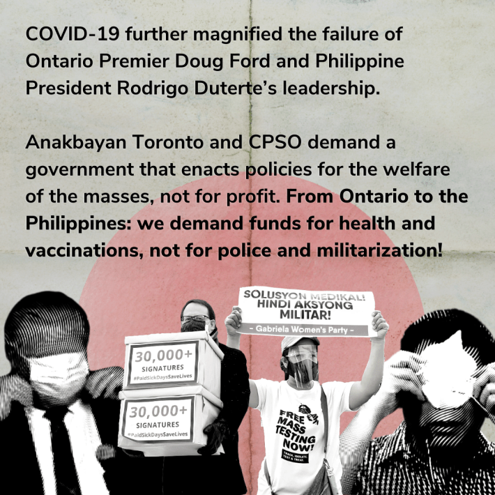 COVID-19 further magnified the failure of Ontario Premier Doug Ford and Philippine President Rodrigo Duterte’s leadership. Anakbayan Toronto and CPSO demand a government that enacts policies for the welfare of the masses, not for profit.