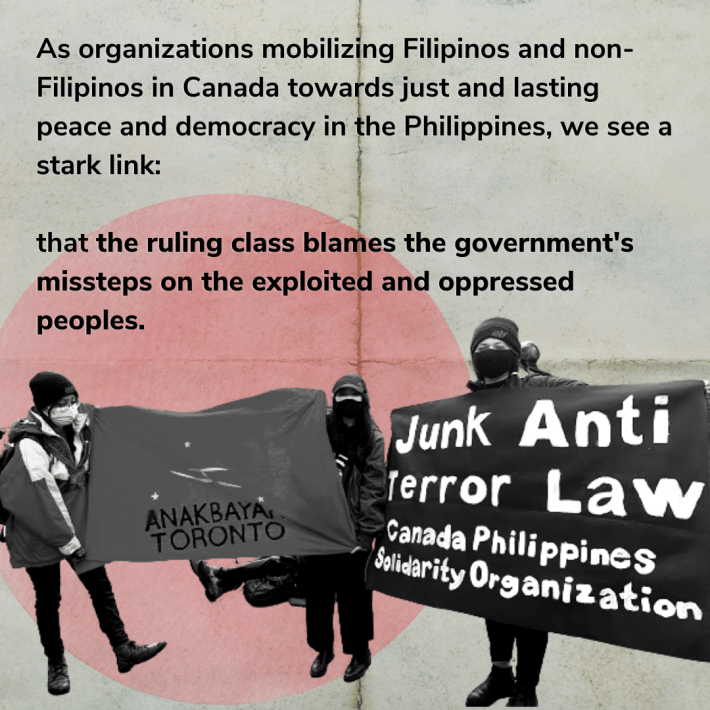As organizations mobilizing Filipinos and non-Filipinos in Canada towards genuine peace and democracy in the Philippines, we see a stark link: that the ruling class blames the governments’ missteps on the exploited and oppressed peoples.
