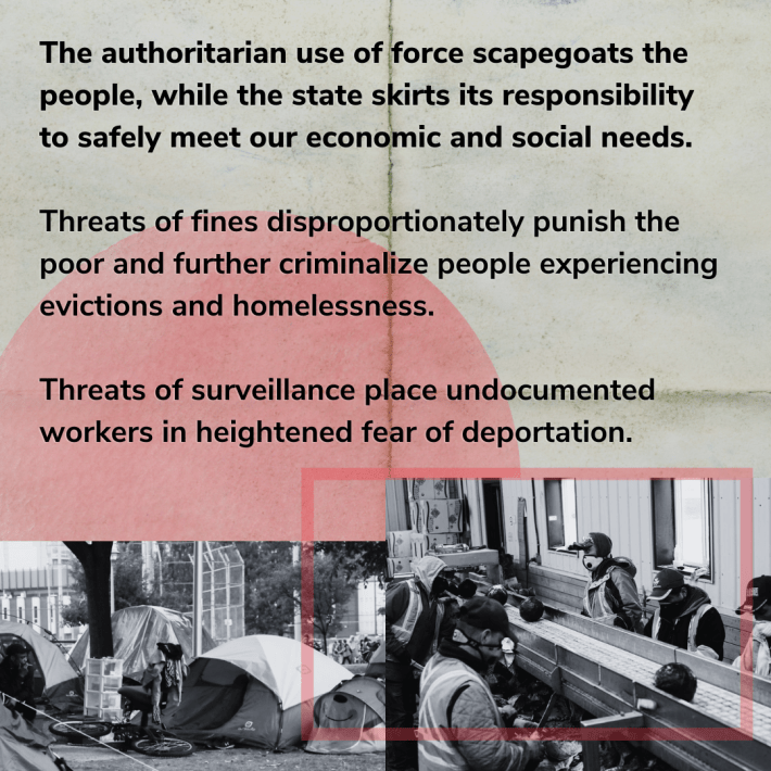 The authoritarian use of force scapegoats the people, while the state skirts its responsibility to safely meet our economic and social needs. Threats of fines disproportionately punish the poor and further criminalize people experiencing evictions and homelessness. Threats of surveillance place undocumented workers in a heightened fear of deportation.