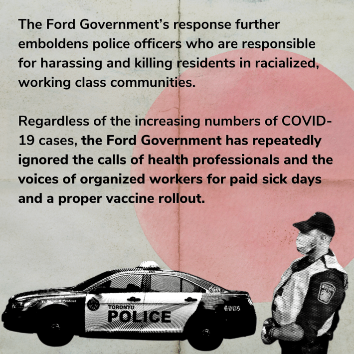 The Ford Government’s response further emboldens police officers who are responsible for harassing and killing residents in racialized, working class communities. Regardless of the increasing numbers of COVID-19 cases, the Ford Government has repeatedly ignored the calls of health professionals and the voices of organized workers for paid sick days and a proper vaccine rollout.