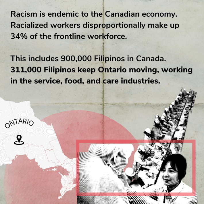 Racism is endemic to the Canadian economy. Racialized workers disproportionally make up 34% of the frontline workforce. This includes 900,000 Filipinos in Canada. 311,000 Filipino keep Ontario moving, working in the service, food, and care industries.