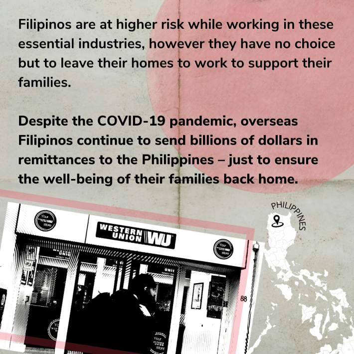 Filipinos are at higher risk while working in these essential industries, however they have no choice but to leave their homes to work to support their families. Despite the COVID-19 pandemic, overseas Filipinos continue to send billions of dollars in remittances to the Philippines – just to ensure the well-being of their families back home.