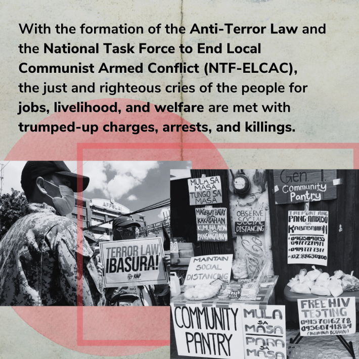 With the formation of the Anti-Terror Law and the National Task Force to End Local Communist Armed Conflict (NTF-ELCAC), the just and righteous cries of the people for jobs, livelihood, and welfare are met with trumped-up charges, arrests, and death.