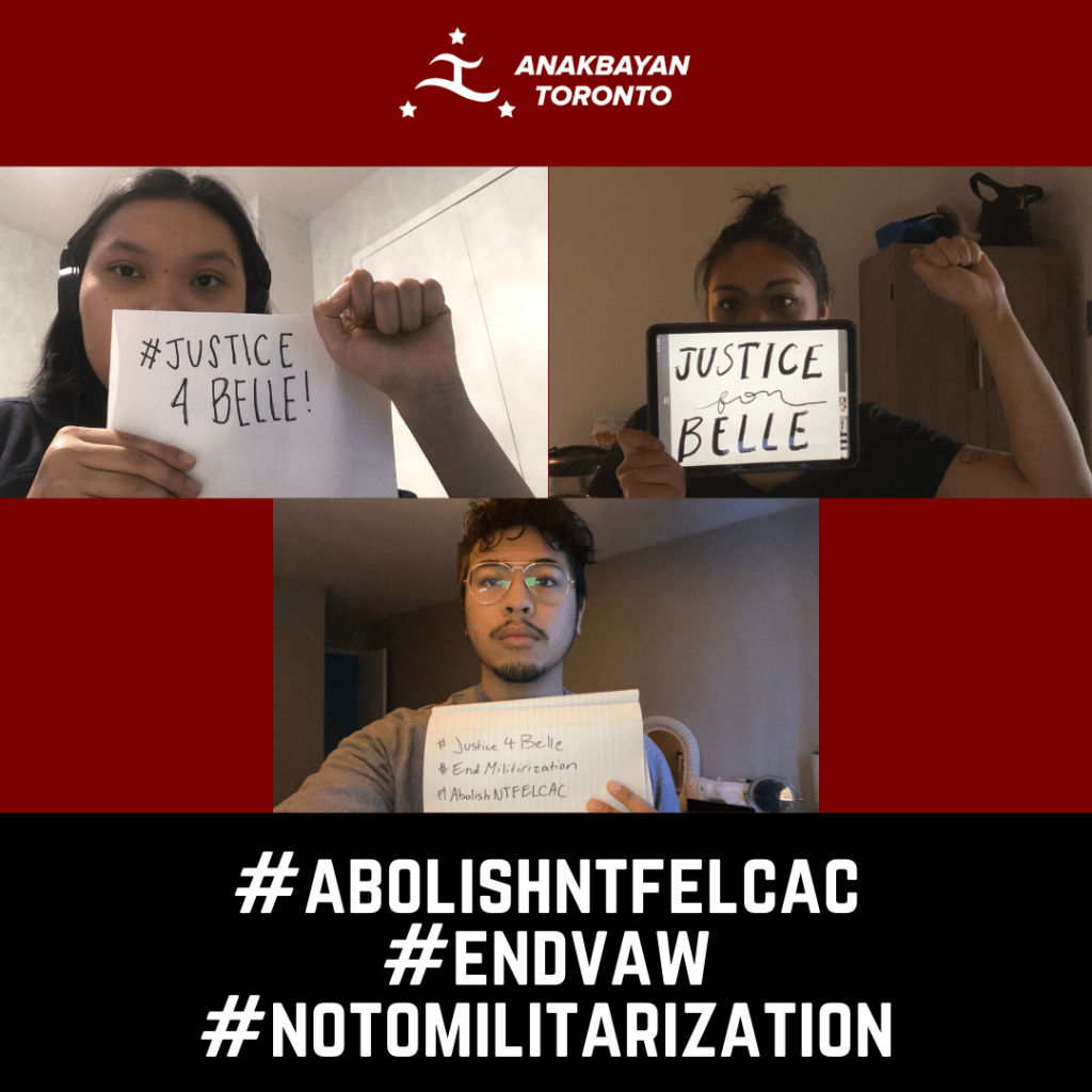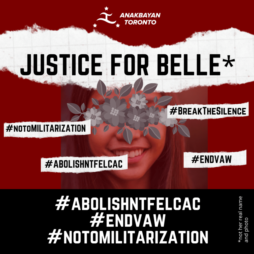 Filipino youth in Toronto stand in solidarity with Belle (not her real name) and her family in their fight for justice against elements of the Armed Forces of the Philippines (AFP) who kidnapped, tortured, and raped Belle at 15 years old.