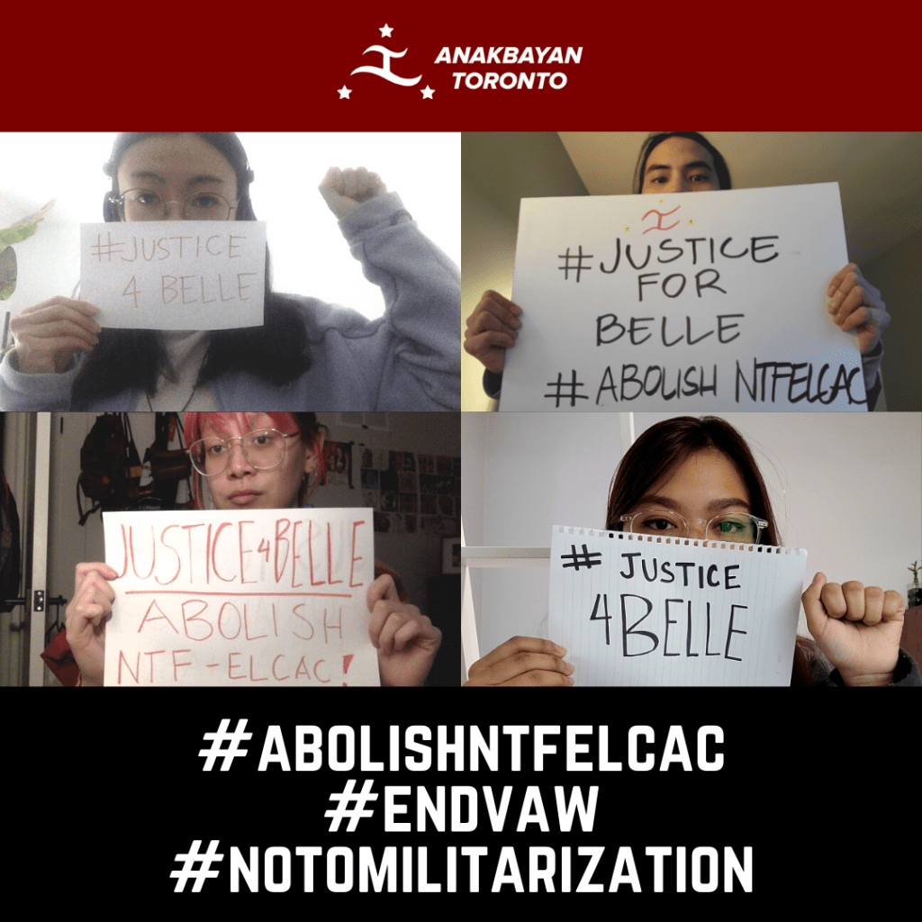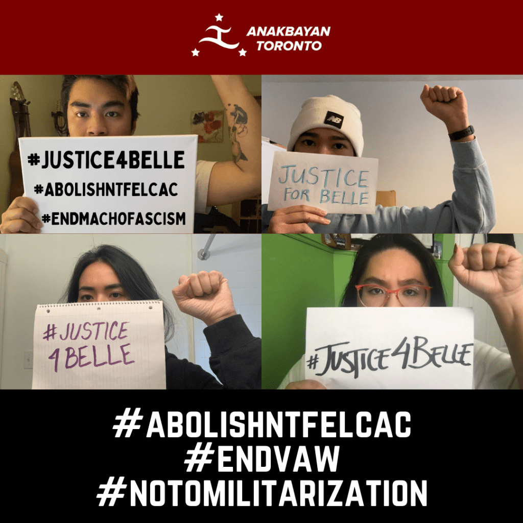 As an international chapter of the largest national democratic organization of Filipino youth, Anakbayan Toronto condemns this heinous crime in the strongest terms. What happened to Belle is the latest addition to the long list of brutal crimes perpetrated against the people by members of the military acting with impunity under Rodrigo Duterte’s regime.