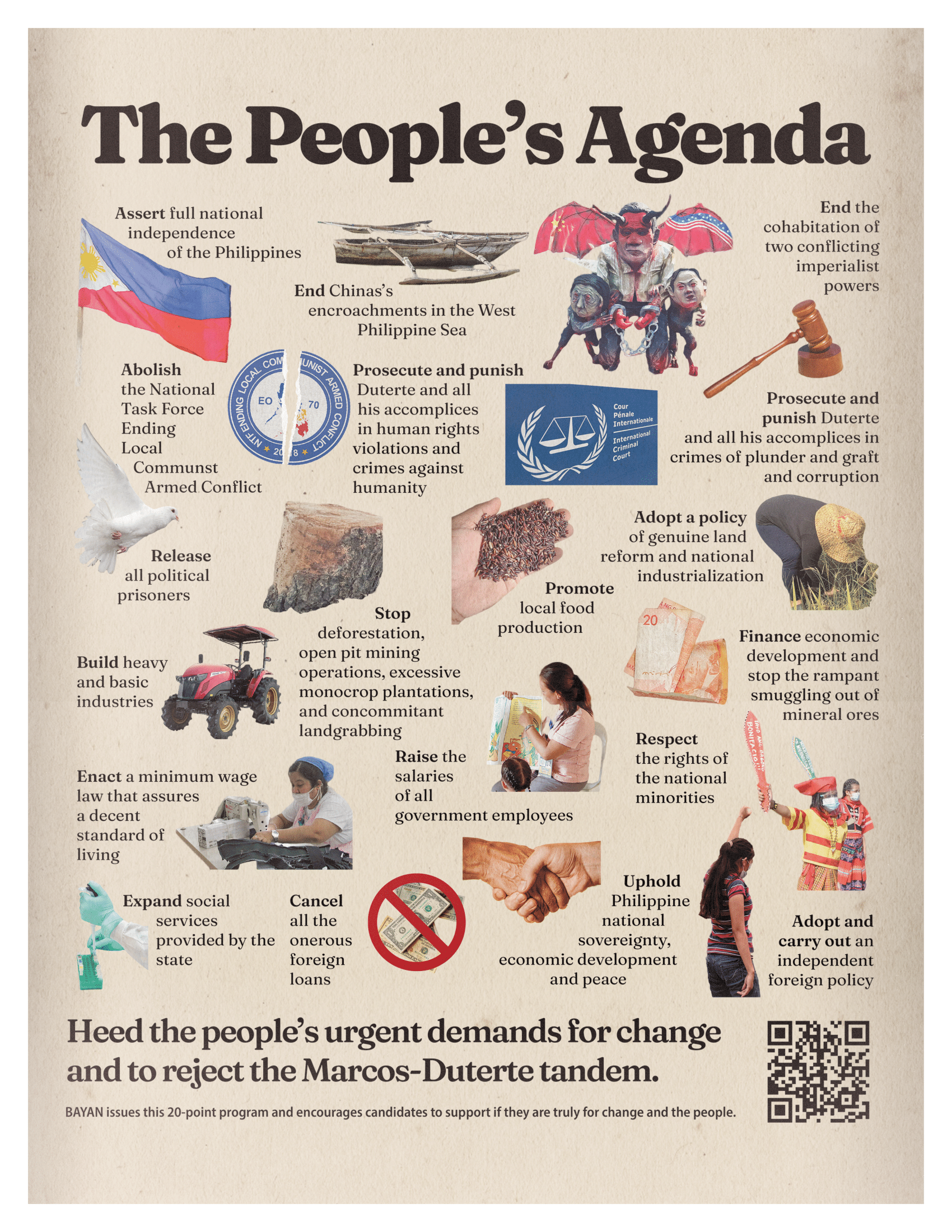 BAYAN Philippines asserts that Filipinos must support political candidates who genuinely fight for the people’s rights and welfare. It order to highlights the calls of the working class and peasant majority of the nation, the following agenda was created to guide our assessment of campaigns and platforms: